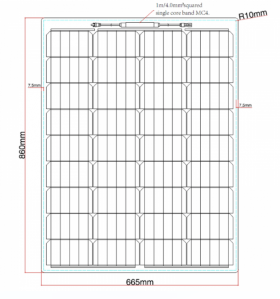 The panel is fitted with 2 x 1m of cable specially designed for solar panels to carry high currents with negligible power loss (4mm² cross section). The cable comes with waterproof MC4 connectors which can be used for easy connectivity to your existing system, for linking several panels together or for connecting 4mm extension cable.