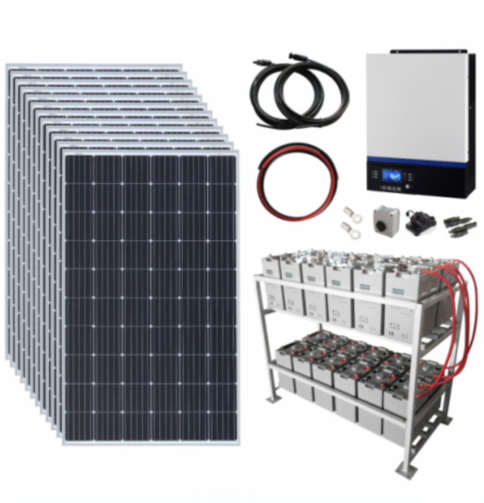 This complete off-grid kit has been expertly designed to maximise efficiency and output and therefore comes equipped with some of our most premium quality products; including twelve powerful 300W solar panels, an advanced 48V 500Ah battery bank and a state-of-the-art Iconica hybrid power inverter – an intelligent combination of a high efficiency MPPT solar charge controller, pure sine wave inverter and smart mains battery charger in one single unit.