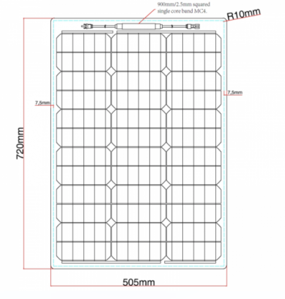 The panel is fitted with 2 x 0.9m of cable specially designed for solar panels to carry high currents with negligible power loss (2.5mm² cross section). The cable comes with waterproof MC4 connectors which can be used for easy connectivity to your existing system, for linking several panels together or for connecting 2.5mm extension cable.
