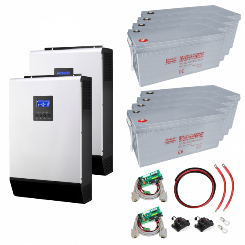 This package includes 2 x UPS units, 2 x parallel connection kits, 8 x 200Ah gel deep-cycle batteries, 4m tinned copper battery cables, battery linking cables, 2 x thermal over-current circuit breakers and loose ring terminals for crimping.