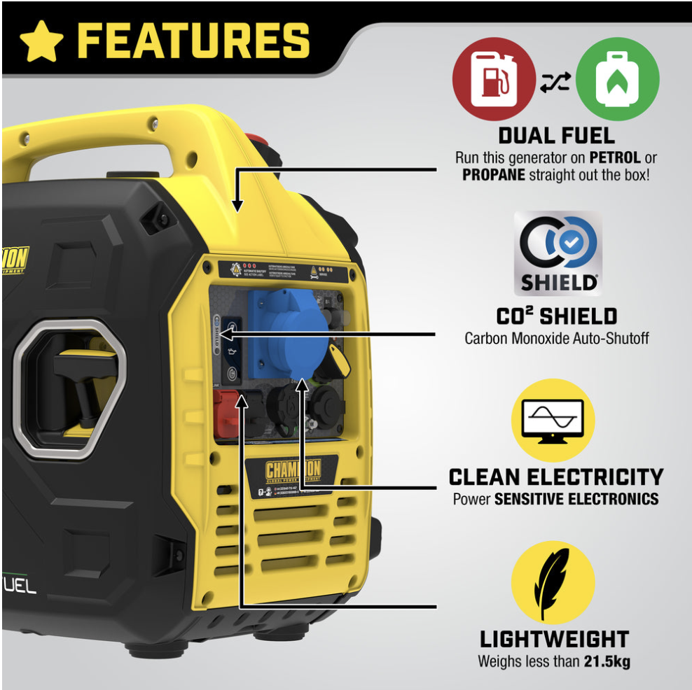 Champion’s 3000 watt dual fuel inverter generator is one of the lightest in the industry at only 21.5kg, making portable power easier than ever!
