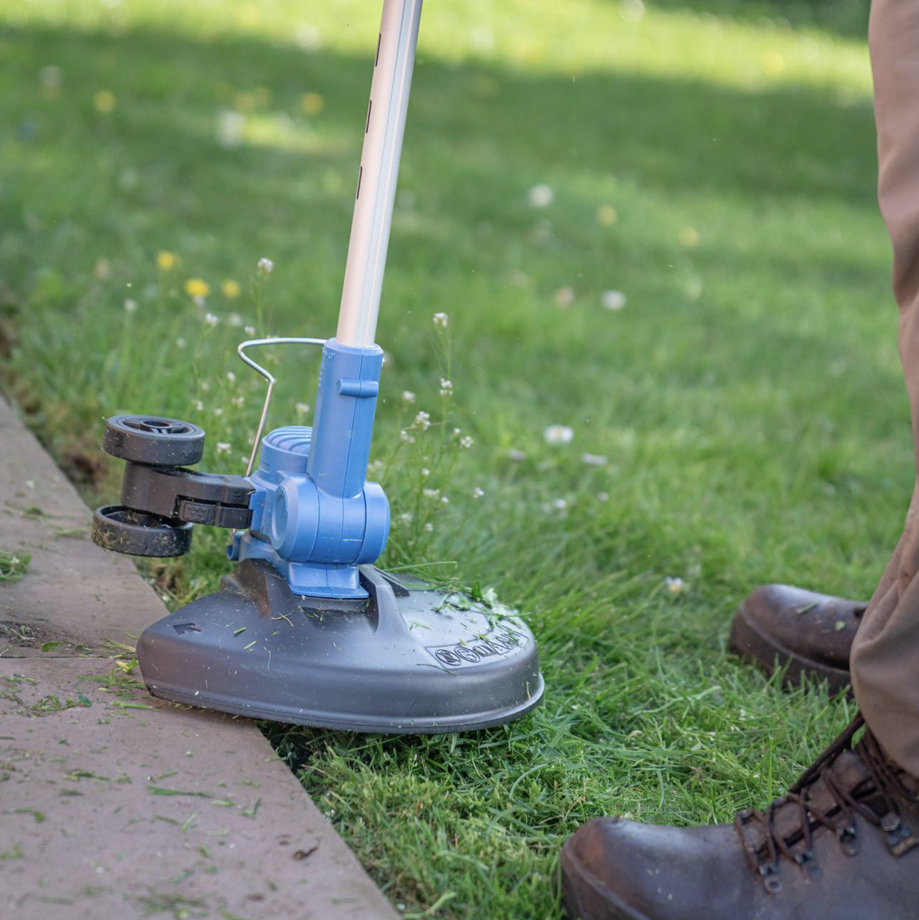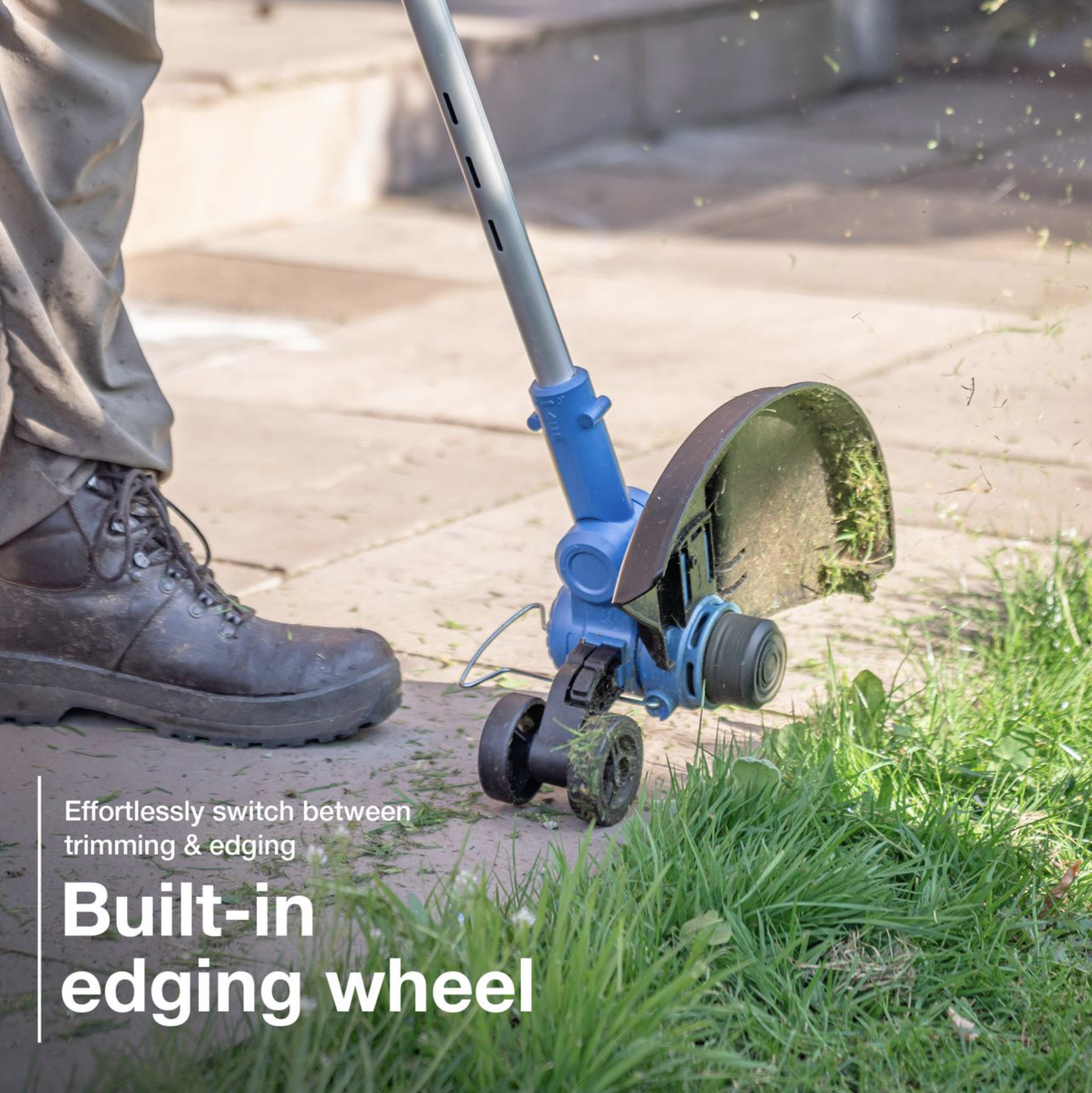 For added versatility, the pivoting head adjusts from 0° to 90°, allowing you to trim awkward areas with ease. The built-in edging wheel makes switching between trimming and edging simple—helping you achieve crisp, professional-looking lawn edges every time.