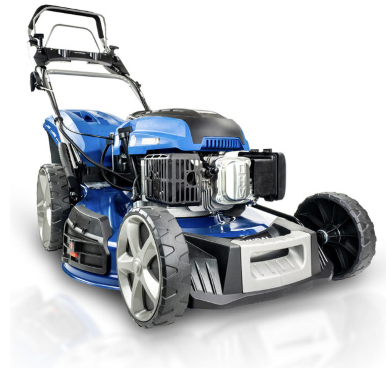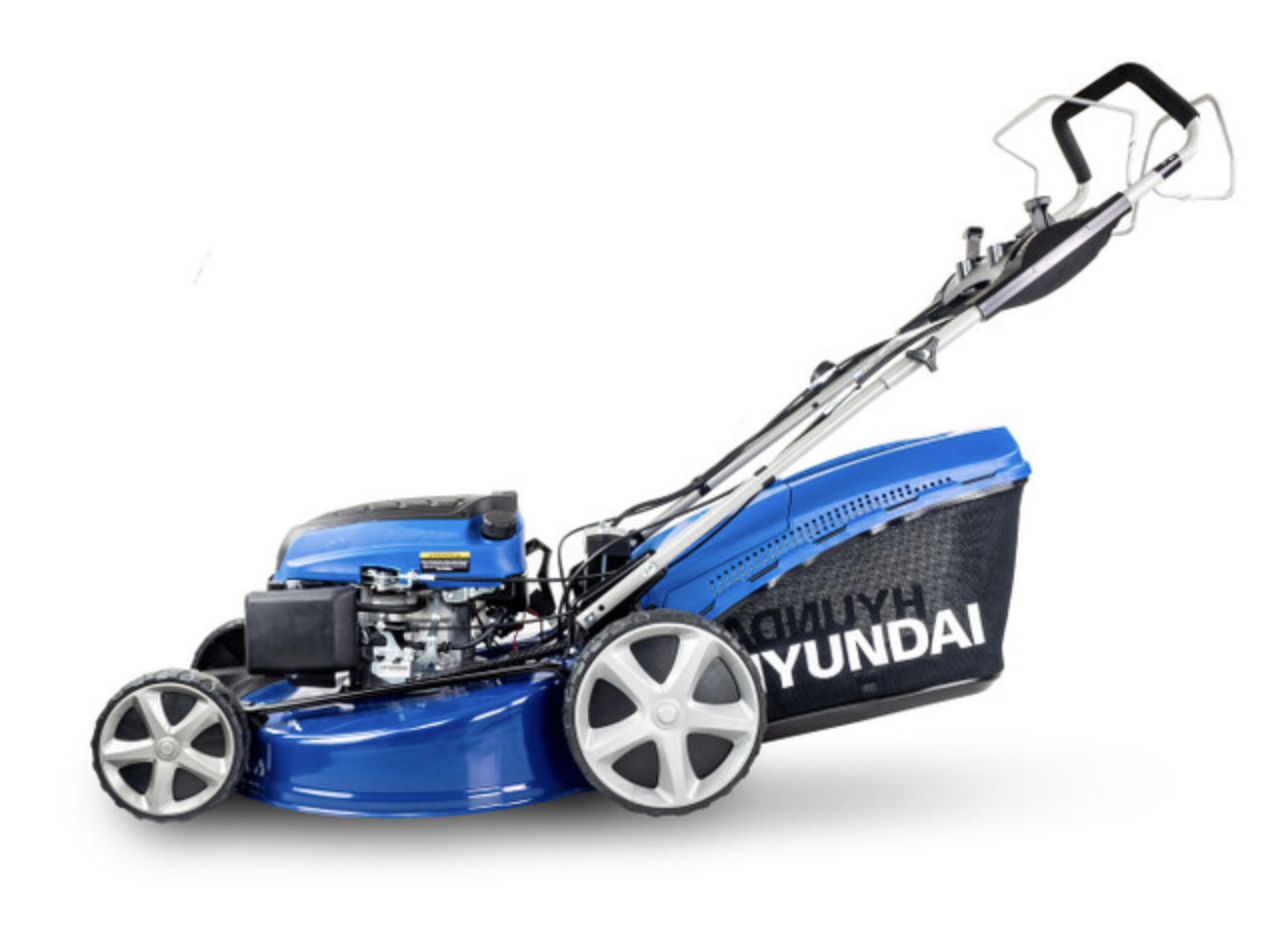 The HYM560SPE is a petrol self-propelled lawn mower from Hyundai with electric push-button start – the largest lawn mower we currently have available. With a powerful Hyundai Euro 5 196cc engine with low fuel consumption, it is able to handle large lawns 2000 sq. ft. / 185m2 (e.g. 13m x 14m) or larger.