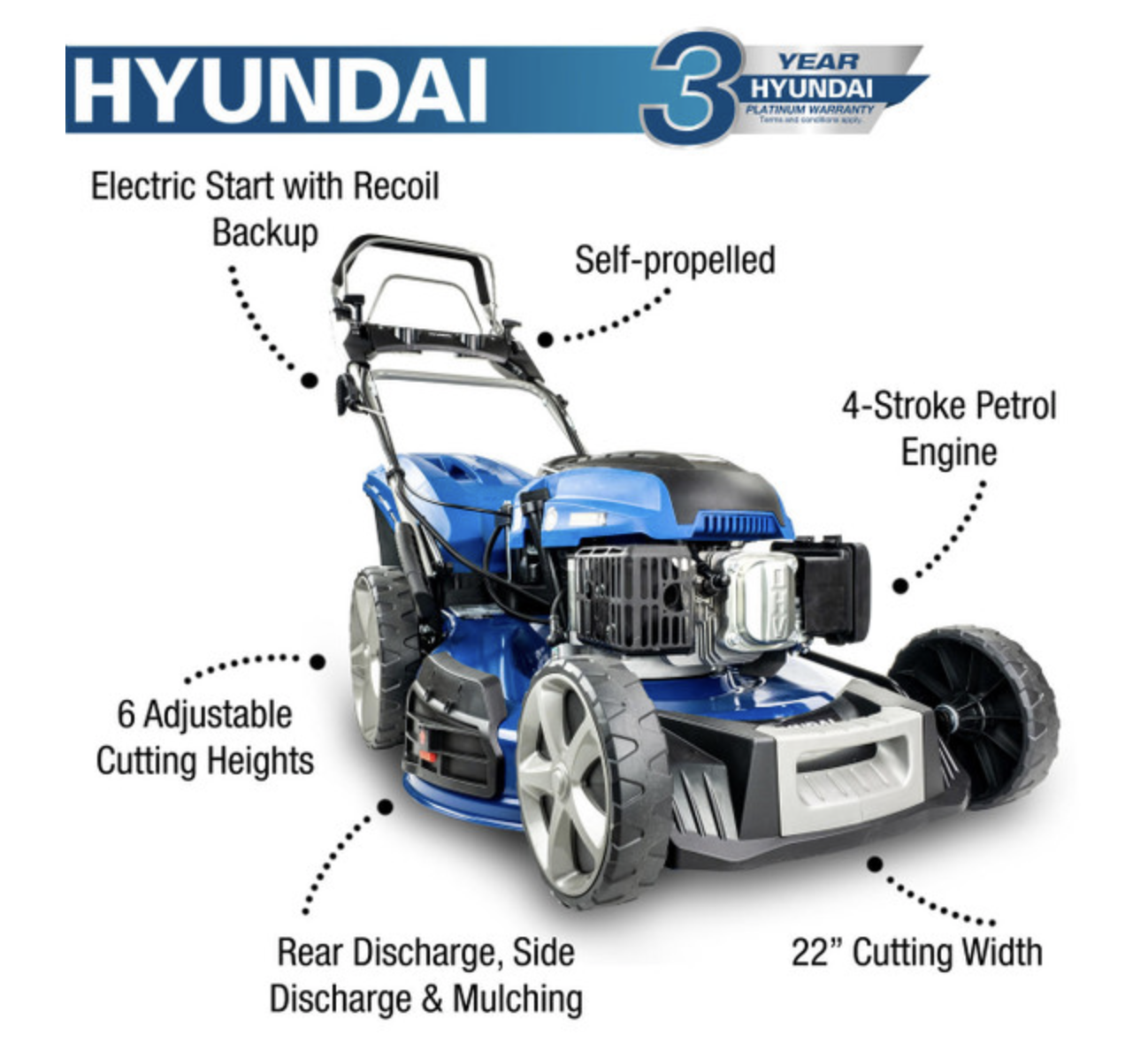 As with all of our Hyundai Lawn Mower range, the HYM560SPE comes with our Hyundai 3 year home-use warranty* / 1 year commercial warranty* (terms apply) for added peace of mind.