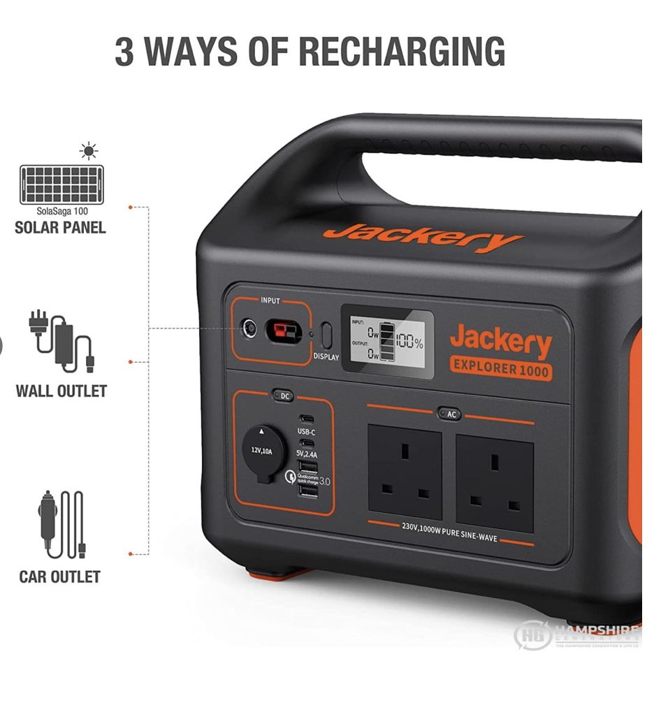 Providing 1000W of clean green energy the Jackery Explorer 1000 solar generator can be recharged using the Jackery Solar Saga 100W solar panel. Using MPPT technology on the Jackery you can use other solar panels to charge the unit as well. Also, the Explorer 1000 can be recharged from a 12V car charger port and AC mains. The Explorer 1000 comes with the SolarSaga Parallel adapter which will allow 2 SolarSaga 100W Solar Panels to be used for solar recharging.