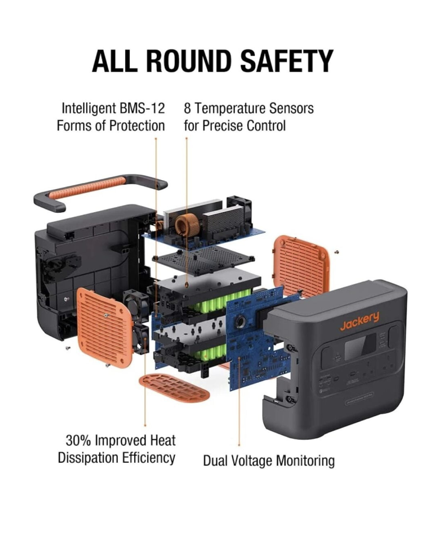 At just 17 KG the Jackery Explorer 1500 Pro is in the lightweight category but can pack a mighty punch with a big 1512Wh battery. Powering your electrical essentials is straight forward, simply plug in and power up or charge. There is up to 1800W of power available with a peak of 3600W powering the 2 x AC outlet, USB-A and USB-C ports. Also, you can power TV’s, Wi-Fi, CPAP’s and small household appliances in case of blackouts.