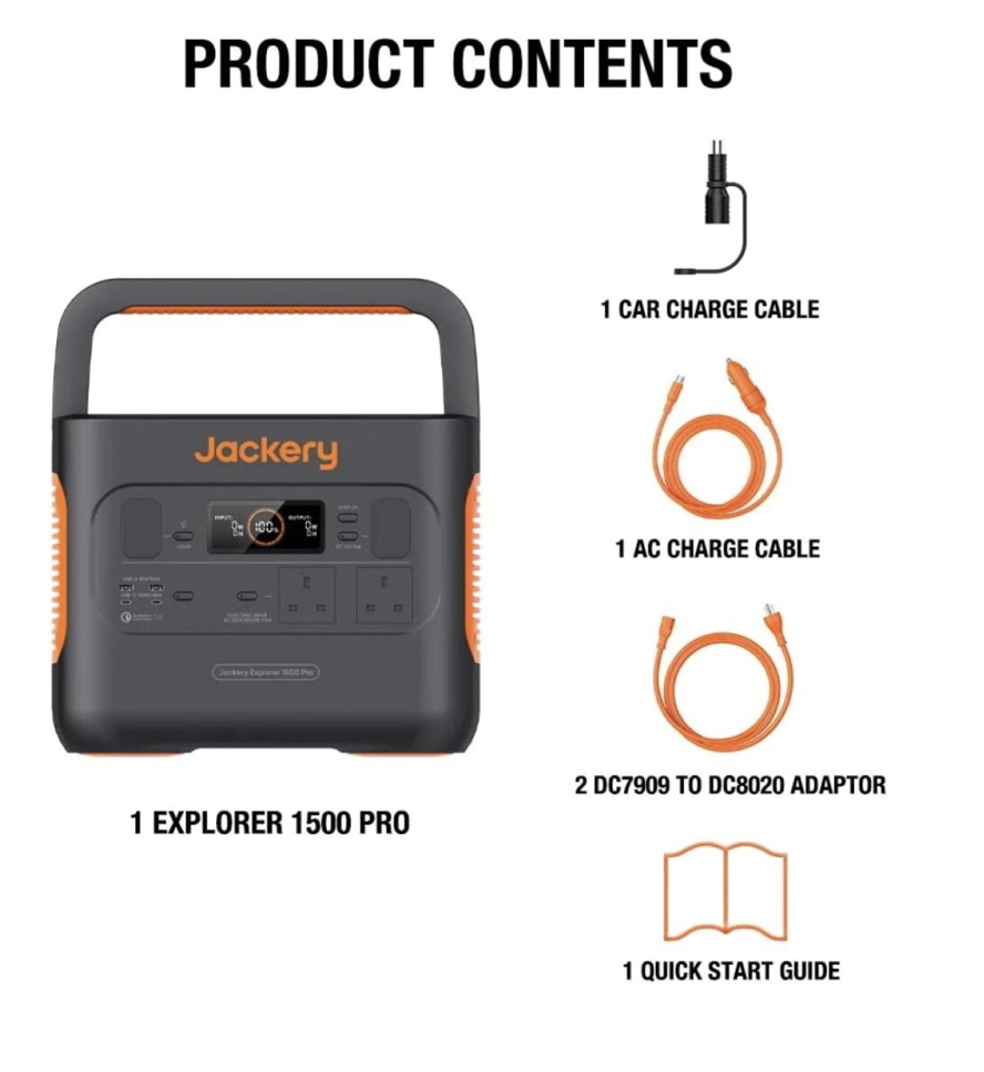 1 x Jackery Explorer 1500 Pro, 1 x Car Charge Cable, 1 x AC Charge Cable, 2 x DC7909 to DC8020 Adapter, 1 x User Manual