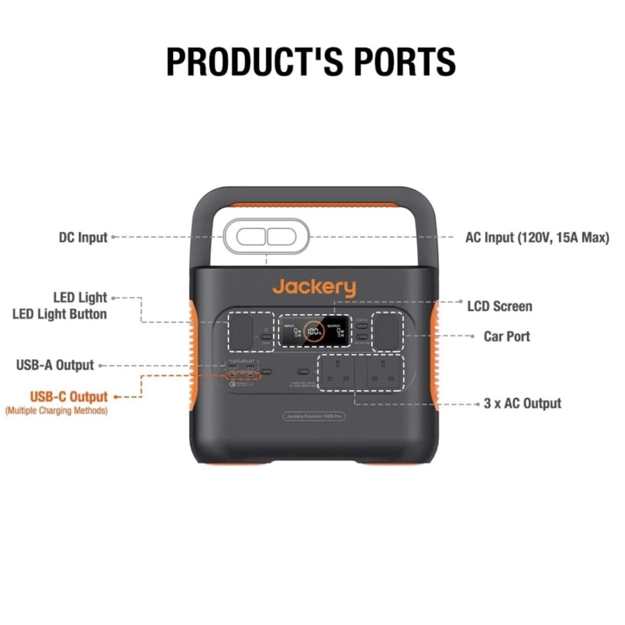 Providing 1500W of clean green energy the Jackery Explorer 1500 Pro solar generator can be recharged using the Jackery Solar Saga 200W solar panel. It takes just 2 hours for a full wall charge and a full solar charge with 6* SolarSaga 200W solar panels. Using MPPT technology on the Jackery you can use other solar panels to charge the unit as well. Also, the Explorer 1500 Pro can be recharged from a 12V car charger port and AC mains.