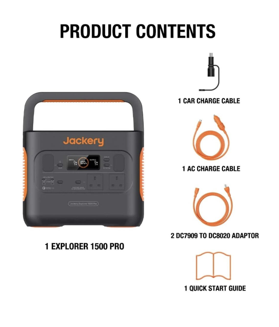 1 x Jackery Explorer 1500 Pro, 1 x Car Charge Cable, 1 x AC Charge Cable, 2 x DC7909 to DC8020 Adapter, 1 x User Manual, 1 x SolarSaga 200W Solar Panel + user manual.