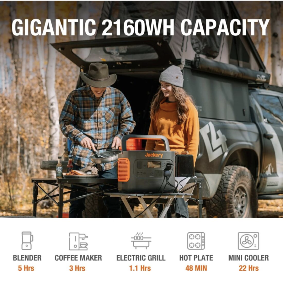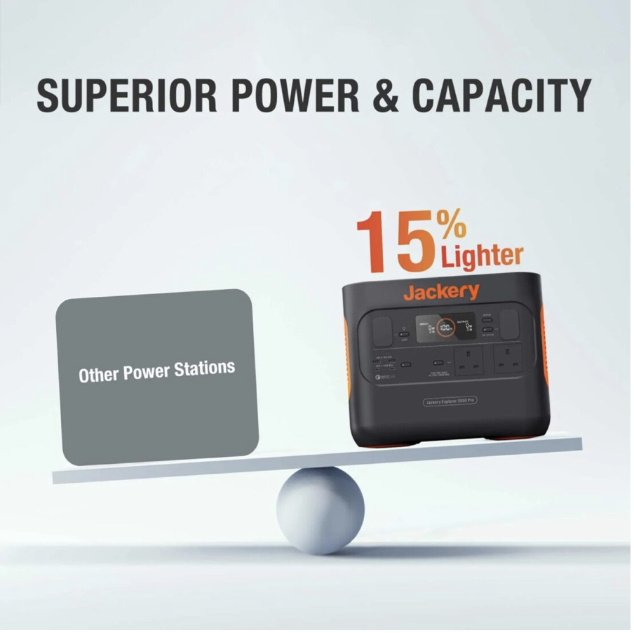 Gone are the times of having to pull start a noisy and smelly petrol generator. Simply plug in your electrical equipment and enjoy your surroundings in peace as nature intended. The Jackery Explorer 2000 Pro solar generator stores power for all your electrical gadgets by the means of its fast-charging lithium-ion battery.