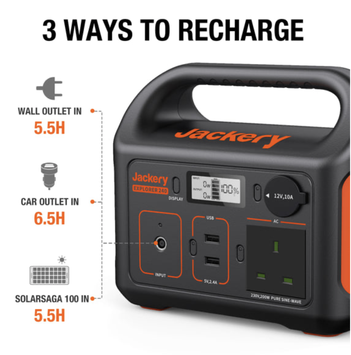 Providing 200W of clean green energy the Jackery Explorer 240 solar generator can be recharged using the Jackery Solar Saga 100W solar panel. Using MPPT technology on the Jackery you can use other solar panels to charge the unit as well. Also, the Explorer 240 can be recharged from a 12V car charger port and AC mains.