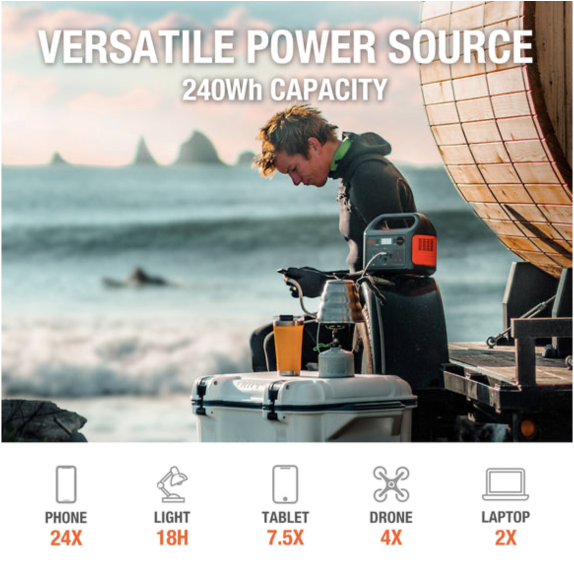 Gone are the times of having to pull start a noisy and smelly petrol generator. Simply plug in your electrical equipment and enjoy your surroundings in peace as nature intended. The Jackery Explorer 240 stores power for all your electrical gadgets by the means of its fast-charging lithium-ion battery.