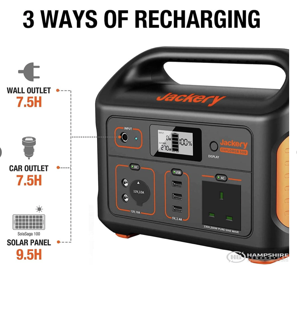 Providing 500W of clean green energy the Jackery Explorer 500 solar generator can be recharged using the Jackery Solar Saga 100W solar panel. Using MPPT technology on the Jackery you can use other solar panels to charge the unit as well. Also, the Explorer 500 can be recharged from a 12V car charger port and AC mains.