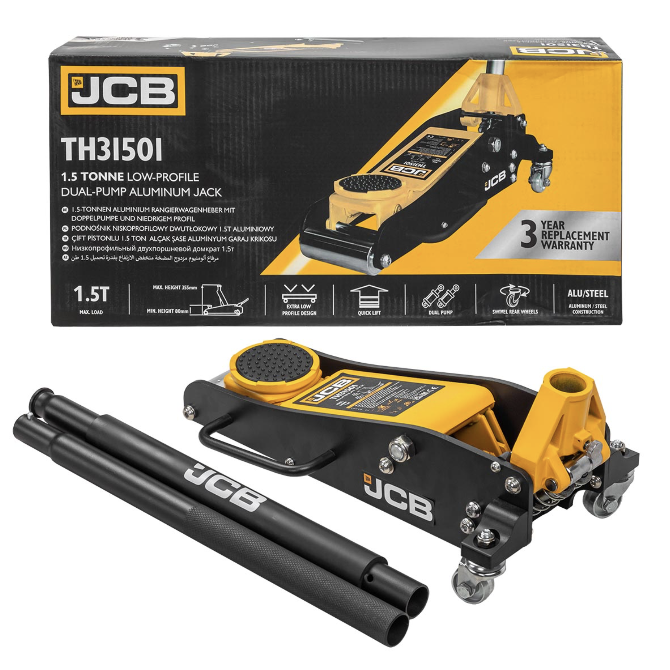 The JCB-TH31501 is a robust, low-profile and double-pump hydraulic trolley jack designed to offer a maximum lifting capacity of up to 1.5 tonnes in weight.