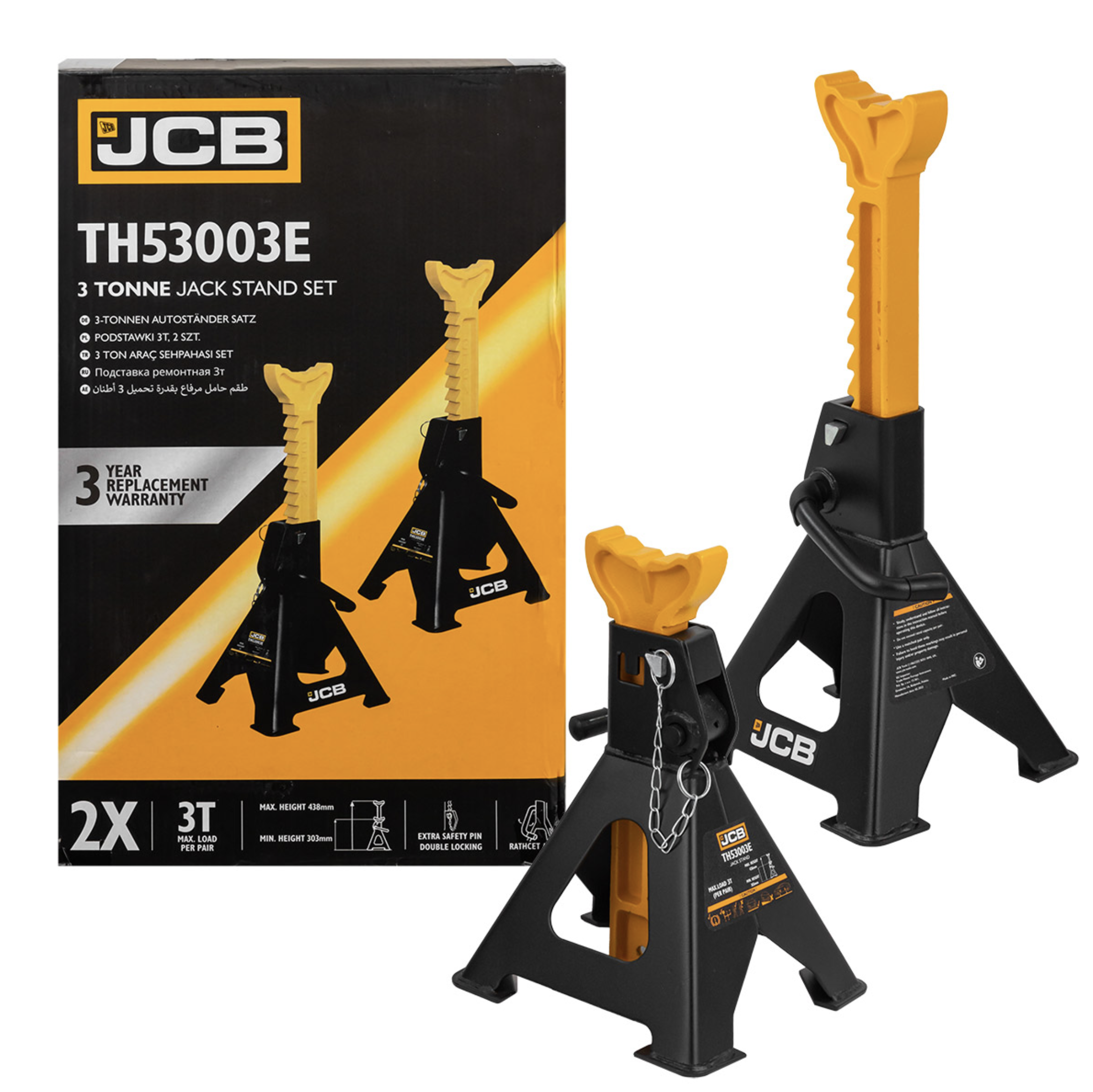 The JCB-TH53003E 3 Tonne Jack Stand Set is a pair of heavy-duty supportive axle stands designed to provide stability and safety when supporting vehicles during maintenance or repairs.