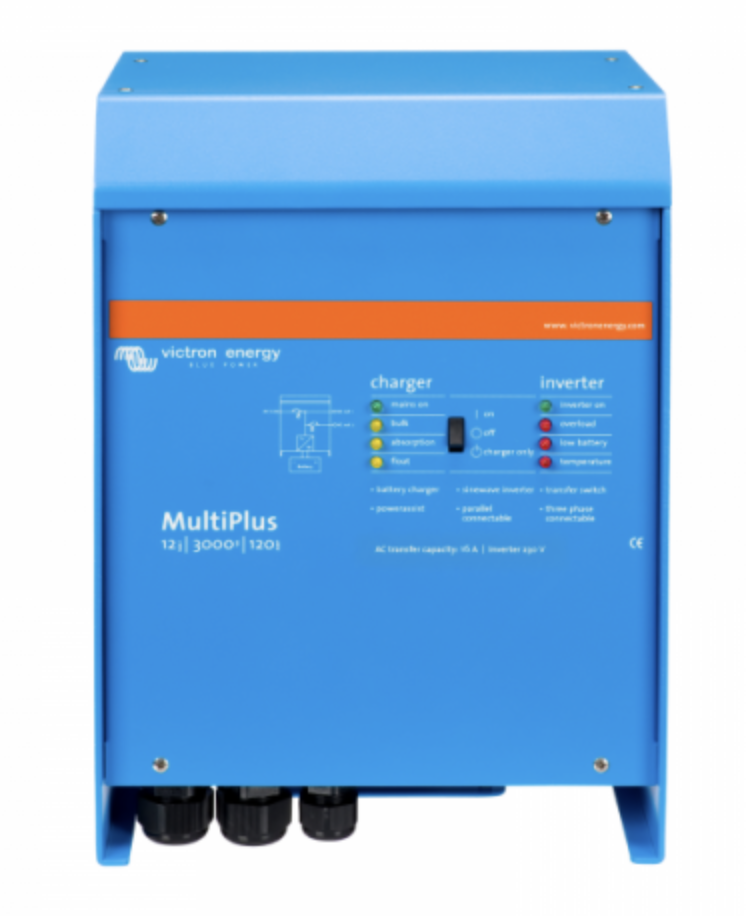 The 12/3000/120-16 MultiPlus intelligently combines the functions of a powerful 3000VA 12V pure sine wave inverter, a sophisticated 120A battery charger which features adaptive charge technology, and a high speed 16A AC transfer switchin one single unit. This makes the MultiPlus ideal for applications with limited space, and allows you to have a more compact and easy-to-troubleshoot system, especially since using the MultiPlus will require less cables compared to using separate units (i.e., separate inverter, battery charger, and AC transfer switch).